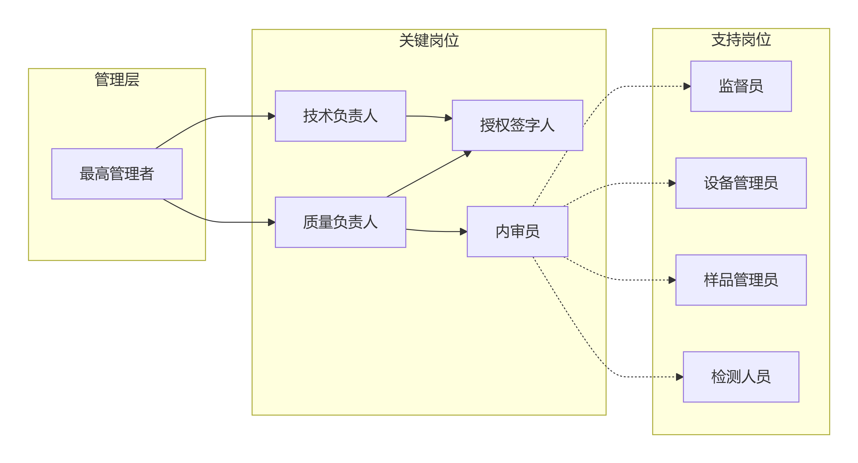 - 岗位设置:确保已任命最高管理者、技术负责人、质量负责人、授权签字人、内审员、监督员等关键岗位人员,并保存任命文件。